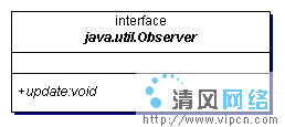 这个接口只定义了一个方法,update()。当被观察者对象的状态发生变化时,这个方法就会被调用。这个方法的实现应当调用每一个被观察者对象的notifyObservers()方法,从而通知所有的观察对象。