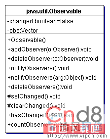 java.util.Observable类还有其它的一些重要的方法。比如,观察者对象可以调用java.util.Observable类的addObserver()方法,将对象一个一个加入到一个列表上。当有变化时,这个列表可以告诉notifyObservers()方法那些观察者对象需要通知。由于这个列表是私有的,因此java.util.Observable的子对象并不知道观察者对象一直在观察着它们。