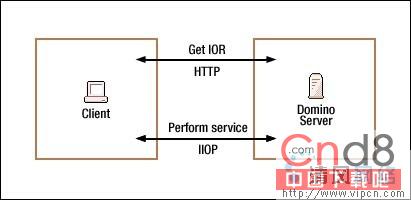 对于本地访问,Java 程序运行在安装有 Notes 客户机或者 Domino 服务器的计算机上。本地类由 JNI(Java Native Interface)构建来,用于访问与 JVM(Java Virtual Machine)相同的进程中的 Notes/Domino 二进制文件。对于远程访问,Java 程序使用 CORBA(Common Object Request Broker Architecture)请求 Domino 服务器所提供的服务。远程类使用 CORBA 通过 TCP/IP 网络访问服务器。远程访问由以下两个部分组成: