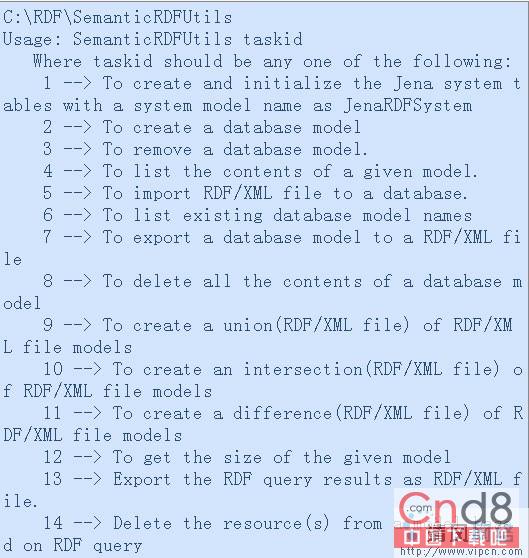一节讲解了一些用于维护Jena数据库和文件模型的有用的工具/脚本。这些脚本文件包含在SemanticRDFUtils-scripts-files.zip文件当中,您可以在资源当中找到。下面的列表中描述了这些脚本文件可以执行的任务。当用户以没有任务ID号作为参数的命令行方式执行SemanticRDFUtils批处理文件时,下面的内容将会出现在你的控制台当中