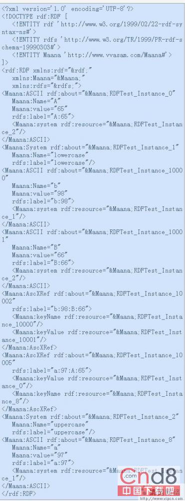 下面的XML格式的RDF和RDFS文件用于显示一个字母顺序的交叉引用模型。它们是使用Protégé 2.1 的图形界面工具创建的。当执行脚本和RDF查询工具的时候我们可以动态的引入RDF文件。RDFS文件则在我们使用Protégé 给RDF文件中加入更多数据时使用。