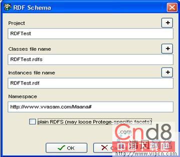 图4显示了Protégé的保存对话框。在其中用户可以填入工程,类文件,实例文件,和命名空间的名字。如图4所示,类文件名中包括RDF Schema的信息,实例文件名中包括RDF的数据。命名空间中以唯一URI的方式标示出RDF模型。