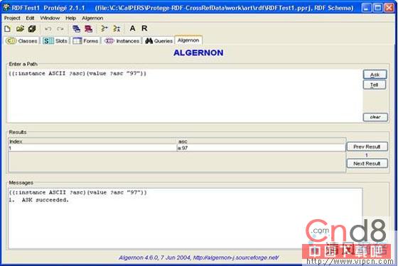 Protégé's的Algernon query标签为进行Algernon查讯提供了一个图形界面,用户可以在这个UI当中进行查询,并查看结果。Algernon是一种基于三元组的查询语言,如图7所示Algernon将资源以遍历(traversal)路径的方式返回给用户。缺省的Algernon并不会如下图那样显示。要看到这个标签,用户必须从工程菜单的设置子菜单中选择。