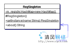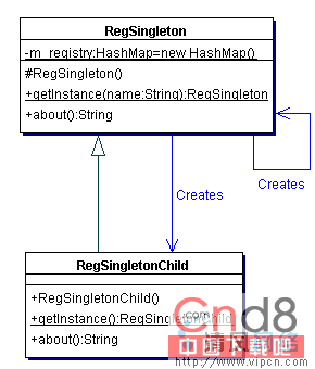 在GoF原始的例子中,并没有getInstance()方法,这样得到子类必须调用文类的getInstance(String name) 方法,并传入子类的名字,很不方便。 作者在登记式单态类子类的例子里,加入了getInstance()方法,这样做的好处是RegSingletonChild 可以通过这个方法,返还自已的实例,而这样做的缺点是,由于数据类型不同,无法在RegSingleton提供 这样一个方法。