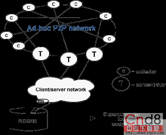 请注重,并列 P2P 网络用来适应网络的多种不同情况,而集中器提供 P2P 网络和传统的客户机/服务器网络之间的连接,数据库服务器和超级计算机驻留在客户机/服务器网络。集中器充当两个网络之间的网桥 ― 每个集中器在 P2P 网络上具有动态特性,在客户机/服务器网络具有静态特性。