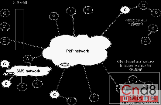 我们不想深入讨论这里的客户机/服务器网络的细节,因为其中并没有什么独特之处;我们甚至可以使用 VPN 技术在因特网上运行它。有趣的部分在 P2P 网络。图 2 显示了它的组成,它可随将来的变化而变化。请注重其中用到的多种不同技术。