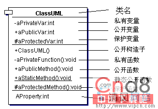 在图1的类图中可以看出,表示类的框分成四层:类名,变量清单,函数清单和属性清单。 变量名如是正体字,表明类是实的(Concrete,即可以实例化的类),变量名如是斜体字,表明类是抽象的。 显然,我们在图中给出了一个实的类。