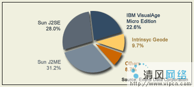 那么,确切地说,它到底有多流行?Evans数据公司总结说,在对444个嵌入式系统开发商的调查中,36%的回应者或者正在使用Java,或者计划在下一个项目中使用。而6个月以前这个数字还是26%。在使用Java的开发者中有将近60%使用的是Sun的JVM工具(31.2%使用J2ME,28%使用J2SE),另有22.6%偏好IBM的Visual Age Micro Edition。图A有细节。