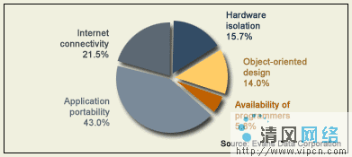 毫不惊异的是,43%的回应者把可移植性作为Java的主要优势。21.5%的回应者将其Internet互联性作为第二大优势。图B显示了整个结果。