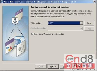 这里是让你选择一个带WEB-INF目录的Web module,假如没有这个目录,则选择New新建一个。我这里已经有了ROOT目录。接下来点击Next,勾选Create runtime……选择Finish,至此WebService框架完成。JBuilder会自动生成一个Apache Axis toolkit页面。