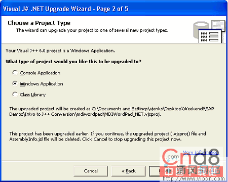 阅读完介绍文字后,单击下一步进入向导的第二页。此页面要求提供您正在升级的项目的类型信息。MDIWordPad 示例是一个 Windows 应用程序,因此默认值是正确的。假如您要升级的项目是一个控制台应用程序或类库,您就应该选择一个选项。确认选定了 Windows 应用程序后,单击下一步进入升级向导的下一页。