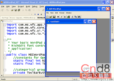 在 Solution EXPlorer(解决方案资源治理器)中双击文件 MDIWordPad.java 以便在 Code Editor(代码编辑器)中将其打开。通过浏览该文件,您会发现源代码看起来与原先完全相同。事实上,将一个项目升级到 Visual J# .NET 并不要求任何形式的源代码修改,所要求修改的只是解决方案、项目和资源文件。源代码文件本身的内容保持不变。