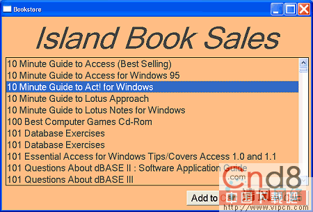 本节将一步步演练将一个 Visual J++ 6.0 应用程序转换到 C# 和 .NET 的过程。要转换的应用程序是一个称为 Island Book Sales 的简单的最终用户购买程序。该应用程序演示转换的各个方面(AWT 到 Windows 窗体、JDBC 到 ADO.NET、Java 到 C#)。它还演示转换后需要解决的一些问题。Island Book Sales 有两个窗体。第一个窗体向用户展示可供出售的书的列表。所提供的书包含在一个 Access 数据库中,可使用 JDBC 读取该数据库。用户可以选择要购买的物品并将它放入购物车中。用户的购物车显示在第二个窗体中。该窗体使用户能够取消或购买购物车中的物品。图 6 是运行中的应用程序。