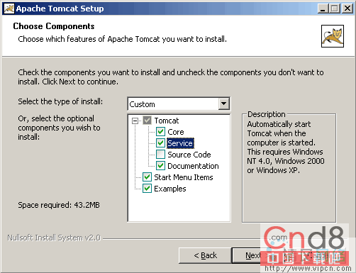 运行jakarta-tomcat-5.0.28.exe 按照提示安装,偶这里选择了Service,就是作为Windows服务来运行。