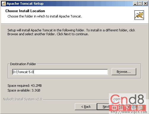 假如要改变安装路径,可以在这个步骤操作,偶这里选择安装在D:Tomcat 5.0
