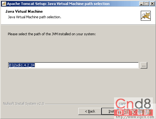 选择J2SDK的安装路径,安装程序会自动搜索,假如没有正确显示,则可以手工修改,偶这里改为d:j2sdk1.4.2_04