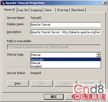 点击Configure...或者双击图标可看到如下显示,选择Startup type为automatic自动启动,这样每次开机后就会自动运行TOMCAT。