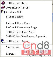 “Contents”菜单项显示所有C++Builder帮助文件总内容的列表。 “Index”菜单项显示使用帮助索引。 “Inprise Home Page”菜单项用于跳转到Inprise公司的主页。 “C++Builder Home Page”菜单项用于跳转到Inprise公司的C++Builder主页。 “Inprise Programs and Services”菜单项用于跳转到Inprise公司的产品和服务主页中。 “C++Builder Direct”用于通过浏览器引导用户访问C++Builder相关网站。 “customize”菜单项用于自定义包含在主帮助内容和索引中的帮助文件。 “About”菜单项用于显示C++Builder的版权和版本号。 (未完待续)
