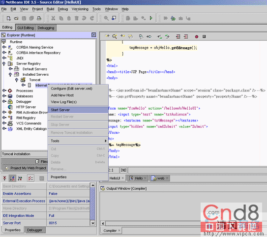 另外一个重要的特征,和典型的代码编辑器不一样的是小型服务器的集成,这也是本文所要着重讲解的地方。NetBeans3.5包含了一个内在的Tomcat的复制,一个公开源小型服务器的集装箱。你也可以随意结合另外一个外在的Tomcat,分开安装。它支持小型服务器的集装箱和NetBeans的调试工具连接,这样,可以为Web应用软件的开发提供健壮的环境。