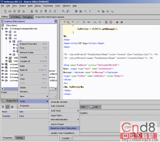 当JSP文件导入Java类,我们应该包括JSP文件路径和Java类文件。扩张结点和包含Hello.java的主函数,接着右键点击结点选择ToolMount作为新的filesystem,对包含HelloUI .jsp的Web使用同样的方法。我们将它们放到类路径中。