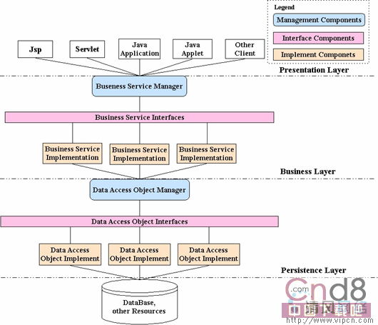 表现层作为业务层的使用者,在使用业务层提供的服务时,通过Business Service Manager这个中介来查找和使用服务接口;业务层是表现层的服务提供者,它把通过各种方式实现的服务对象注册到Business Service Manager,供表现层对象使用,同时业务层也是数据持久层服务的使用者,它通过Data Access Object Manager这个中介来使用数据持久层提供的服务;同样数据持久层把对数据库,文件等资源的存取进行封装,把以各种方式提供的服务对象以接口的形式注册到Data Access Object Manager,供业务层对象使用。