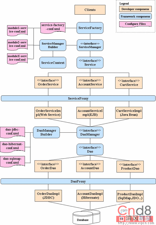 l ServiceFacotry:作为表现层调用业务层的Facade,它读取service-factory-conf.xml配置文件,创建用于各个模块的ServiceManager,便于多个开发小组的分工合作。