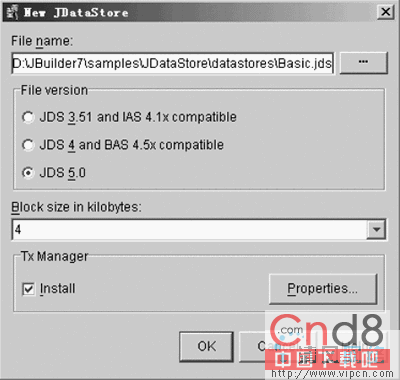 6.假如是非事务性(No Transact ional)的JDataStore,则无须选择TxManager Install;假如是事务性的JDataStore,一定要选择Install。这时可以通过点击Properties来设置属性。