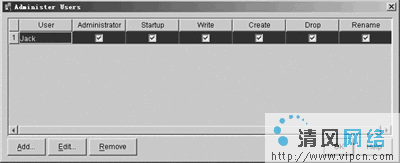 假如你以治理员登录,这时就会弹出一个如图7的对话框。通过治理员用户对话框可以增加用户、删除用户和编辑用户权限等。