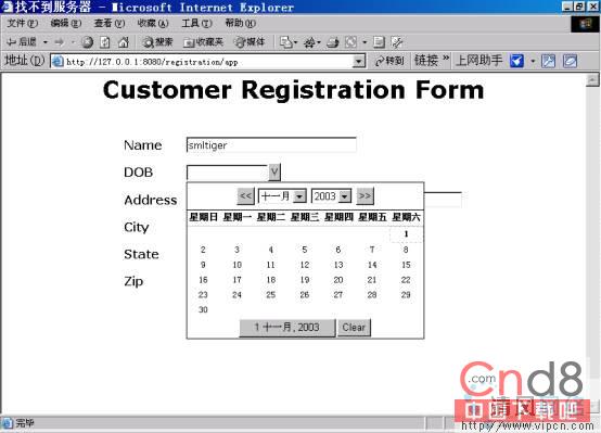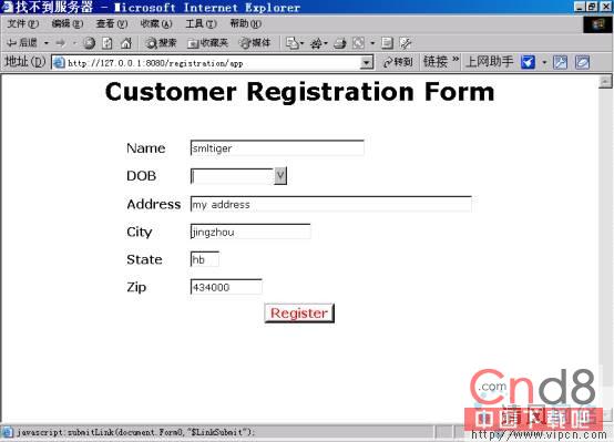 也许你会说,咦,这不是和JSP的表单差不多的吗?是的,虽然看上去差不多,但原理大不一样,由于它是基于组件的,所以Name、DOB、Address、City、State、Zip和Register按钮都是单独的组件,而不是普通的表单了。
