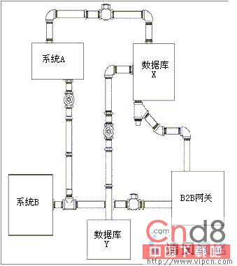 EAI开发者从事点对点整合是因为他们发现其轻易理解并且当只有少量系统要整合时可以快速实现。一个点对点综合例子:一个应用程序直接利用JDBC(Java数据库连接)调用另一个应用程序的数据库表。最初,当你整合两个应用时,点对点整合解决方案象是正确的选择;然而,当你整合额外的应用时,你会发现一种情形如下图1所示。