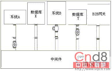 中间件正起到提供一个应用程序间协调点的作用。中间件提供通用接口,所有整合应用可以用其相互传递消息。每个接口定义了一个由另一个应用程序提供的商业过程。图3显示了使用中间件面向服务架构的一个逻辑描述。