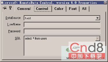 在Control选项卡中选择数据源test,在SQL中输入SQL语句例如:select * from users