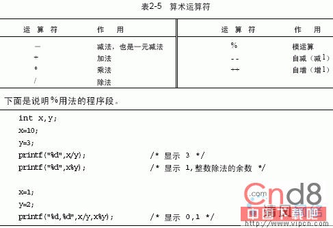 一元减法的实际效果等于用-1乘单个操作数,即任何数值前放置减号将改变其符号。模运算符“%”在C语言中也同它在其它语言中的用法相同。切记,模运算取整数除法的余数,所以“%”不能用于float和double类型。