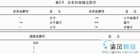 关系运算符中的“关系”二字指的是一个值与另一个值之间的关系,逻辑运算符中的“逻辑”二字指的是连接关系的方式。因为关系和逻辑运算符常在一起使用,所以将它们放在一起讨论。关系和逻辑运算符概念中的要害是True(真)和Flase(假)。C语言中,非0为True,0为Flase。使用关系或逻辑运算符的表达式对Flase和Ture分别返回值0或1(见表2-6)。