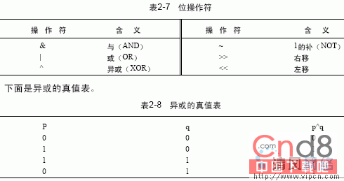 与其它语言不同,C语言支持全部的位操作符(BitwiseOperators)。因为C语言的设计目的是取代汇编语言,所以它必须支持汇编语言所具有的运算能力。位操作是对字节或字中的位(bit)进行测试、置位或移位处理,这里字节或字是针对C标准中的char和int数据类型而言的。位操作不能用于float、double、longdouble、void或其它复杂类型。表2-7给出了位操作的操作符。位操作中的AND、OR和NOT(1的补码)的真值表与逻辑运算等价,唯一不同的是位操作是逐位进行运算的。