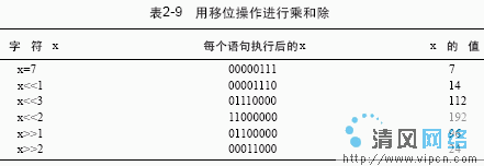 移位操作可对外部设备(如D/A转换器)的输入和状态信息进行译码,移位操作还可用于整数的快速乘除运算。如表2-9所示(假定移位时补0),左移一位等效于乘2,而右移一位等效于除以2。