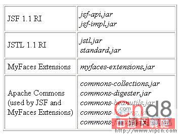 目前最主要的实现JSF规范的框架有JSF Reference Implementation (RI)以及Apache提供的MyFaces。虽然还有别的,但这两个是最流行的。很多开发者更倾向于JSF RI,因为这是来自于sun的官方产品。但MyFaces有一些有趣的扩展的功能,比如上传文件。假如你喜欢,你可以同时使用MyFaces的扩展功能和JSF RI。你只需要把myfaces-extensions.jar和JSF RI的jar文件以及 commons-fileupload-1.0.jar 放在web应用程序的WEB-INF/lib 目录下即可。下面是你需要的jar文件: